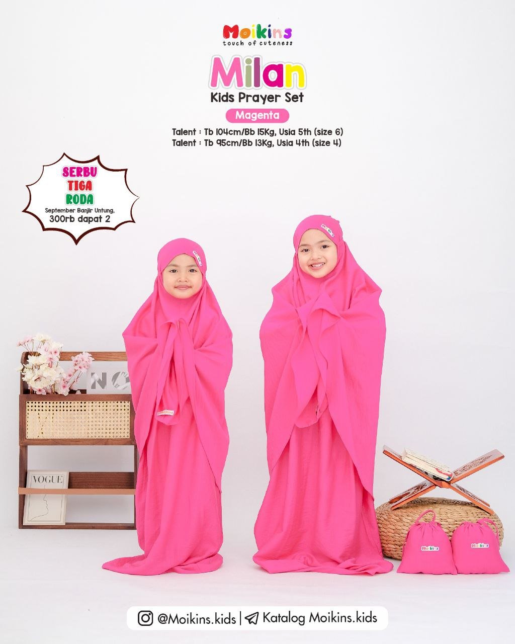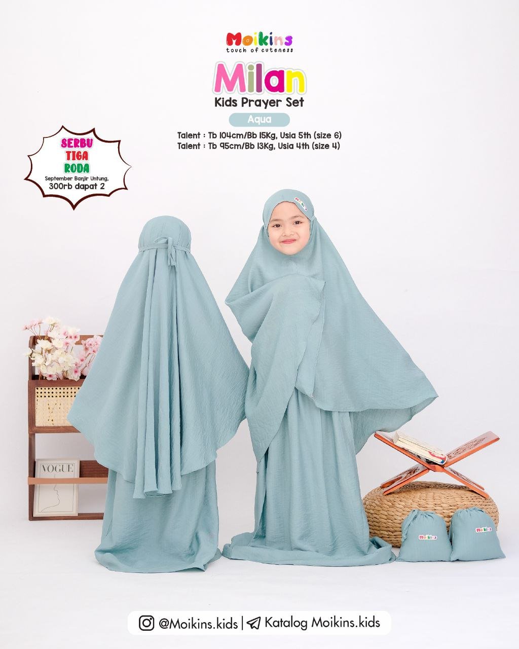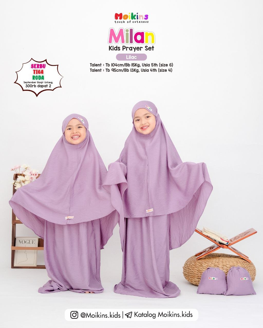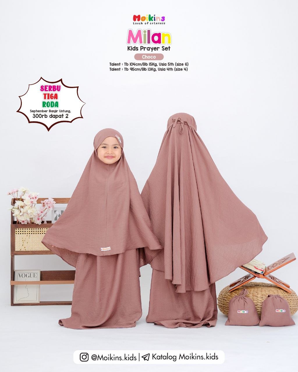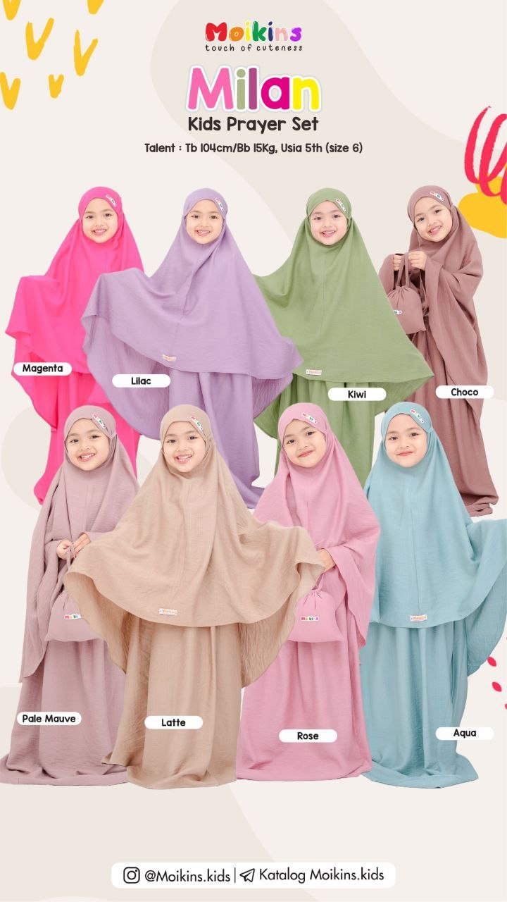 Cutting prayer set ini di produksi sangat sesuai dengan toddler, sehingga sikecil tidak kesulitan saat memakainya. Di bagian atas dahi sebelah kanan terdapat sentuhan label rainbow moikins yang membuat kesan manis, dan dilengkapi juga pouch super gemes yang cocok di bawa saat traveling.