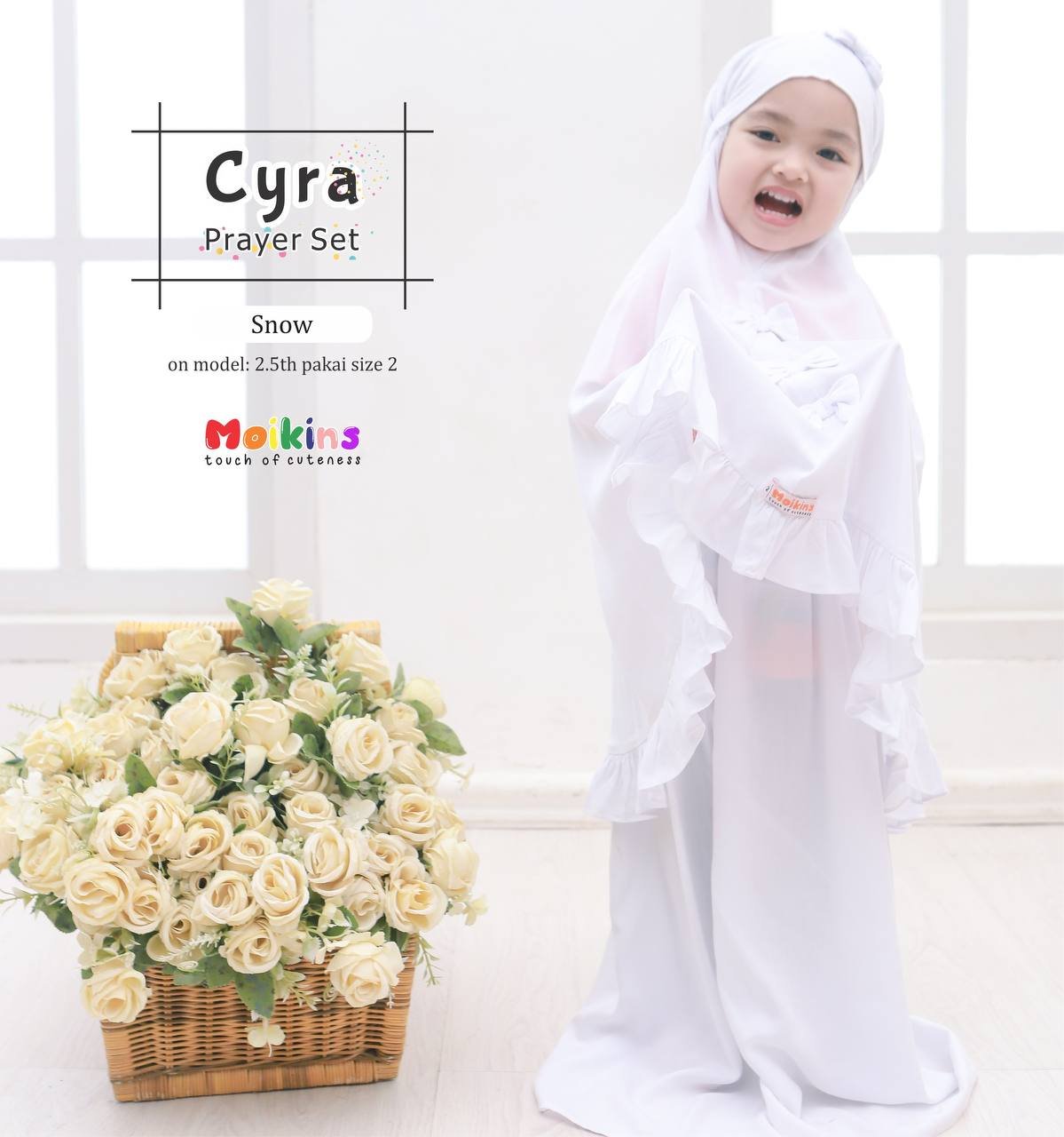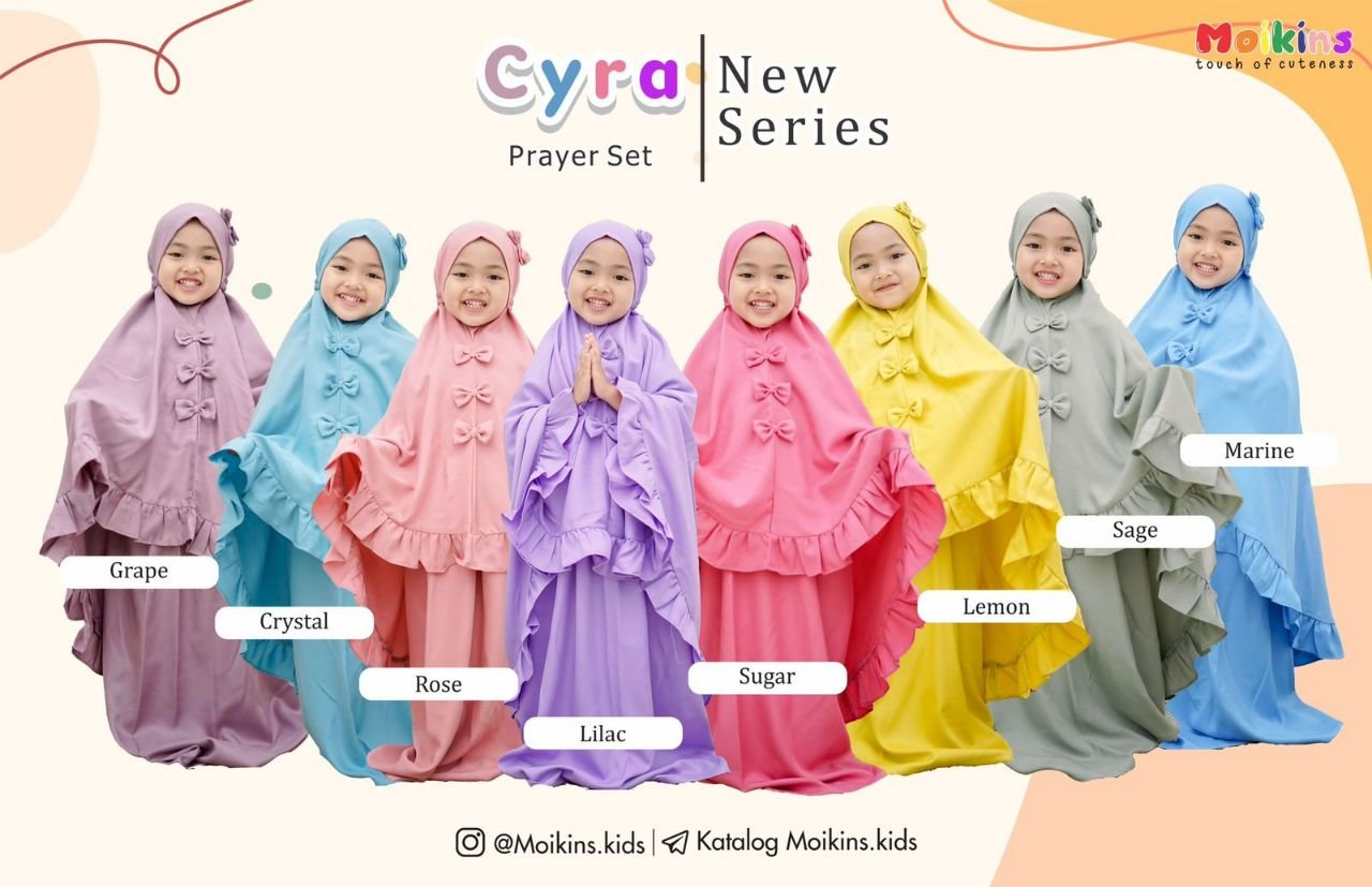 Cyra prayer set didesain untuk anak-anak yang sedang belajar shalat dan selalu ingin bergabung bersama bunda dan kakak-kakaknya 😍. Diproduksi dalam ukuran yang sesuai dengan toddler, tidak terlalu besar/lebar sehingga anak-anak tidak kesulitan selama memakainya. Apalagi aksen pita yang diaplikasikan membuat Cyra Prayer Set semakin gemassh saat dikenakan buah hati.