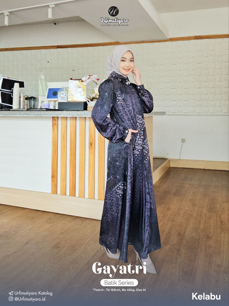 Gayatri dress memiliki motif batik dengan kombinasi pattern bunga dan geometri serta logo u signature Urfimutiyaro yang menjadi highlight Batik Series kali ini. Pattern Gayatri dress diproduksi dengan teknik digital printing, sehingga warna yang dihasilkan tajam dan tidak luntur.