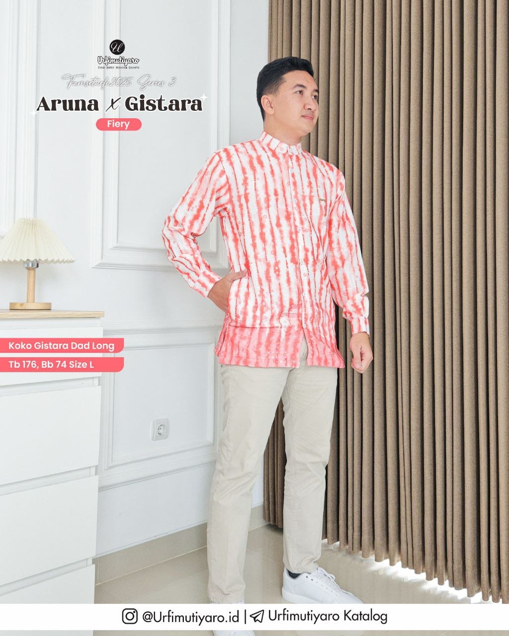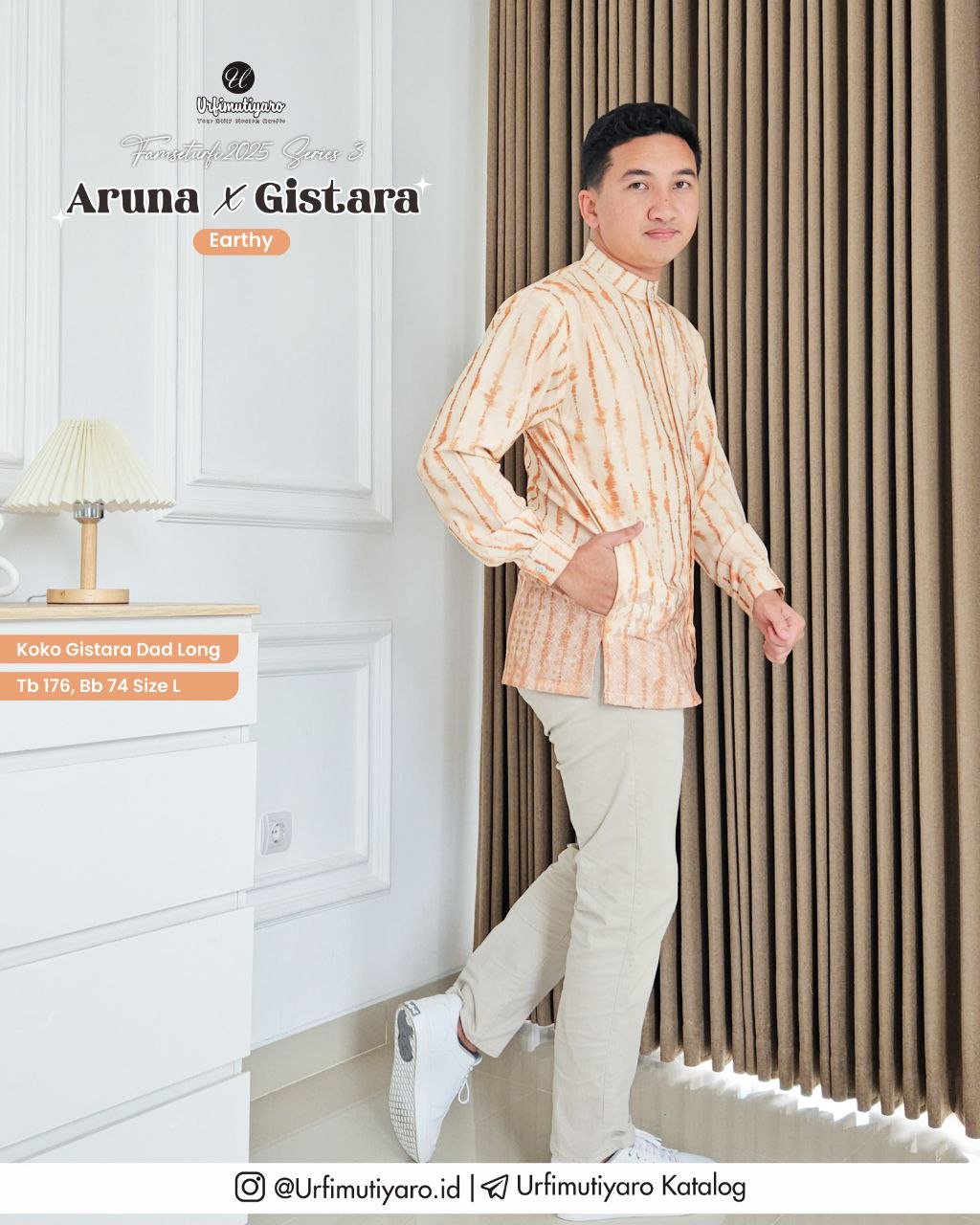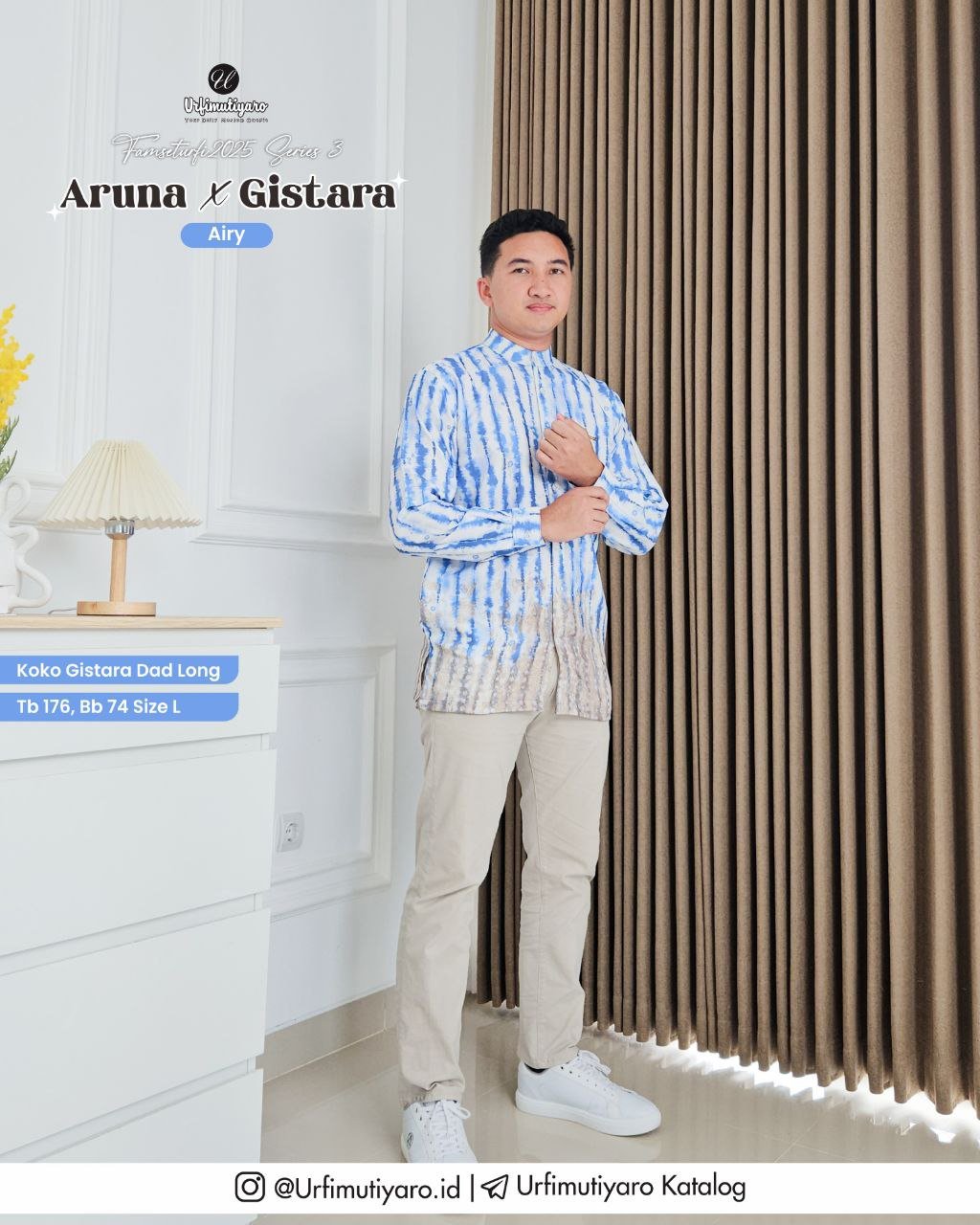 Aruna x Gistara Couple menggunakan material HAGIA DELUXE, memiliki karakteristik bahan yang ringan, flowy, dan tidak mudah kusut, yang mana material ini dapat membuat koko Gistara terlihat firm dan gagah saat dikenakan.