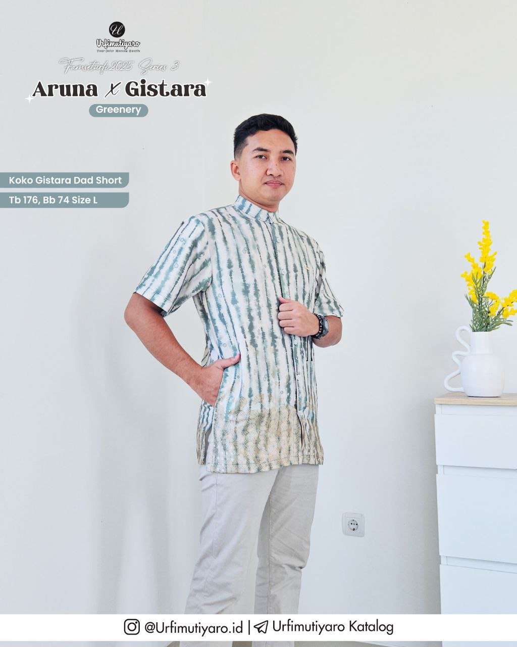 Aruna x Gistara Couple menggunakan material HAGIA DELUXE, memiliki karakteristik bahan yang ringan, flowy, dan tidak mudah kusut, yang mana material ini dapat membuat koko Gistara terlihat firm dan gagah saat dikenakan.