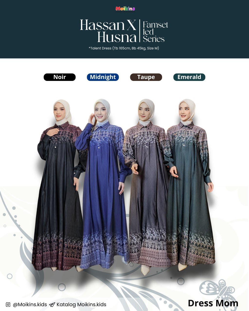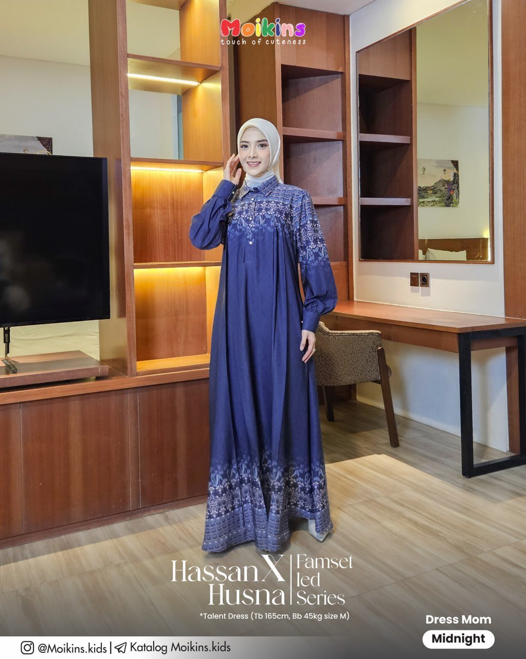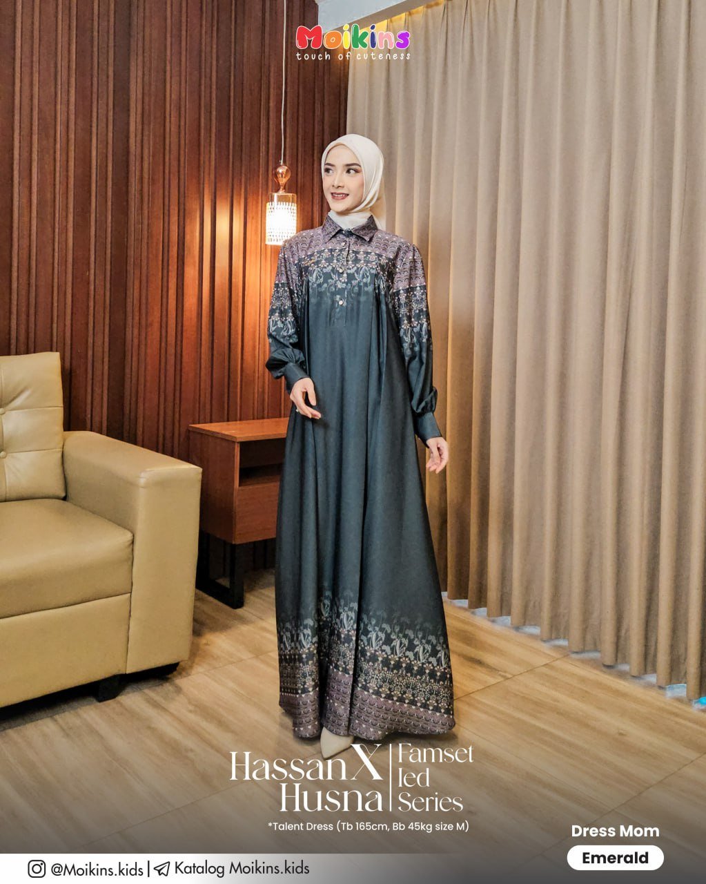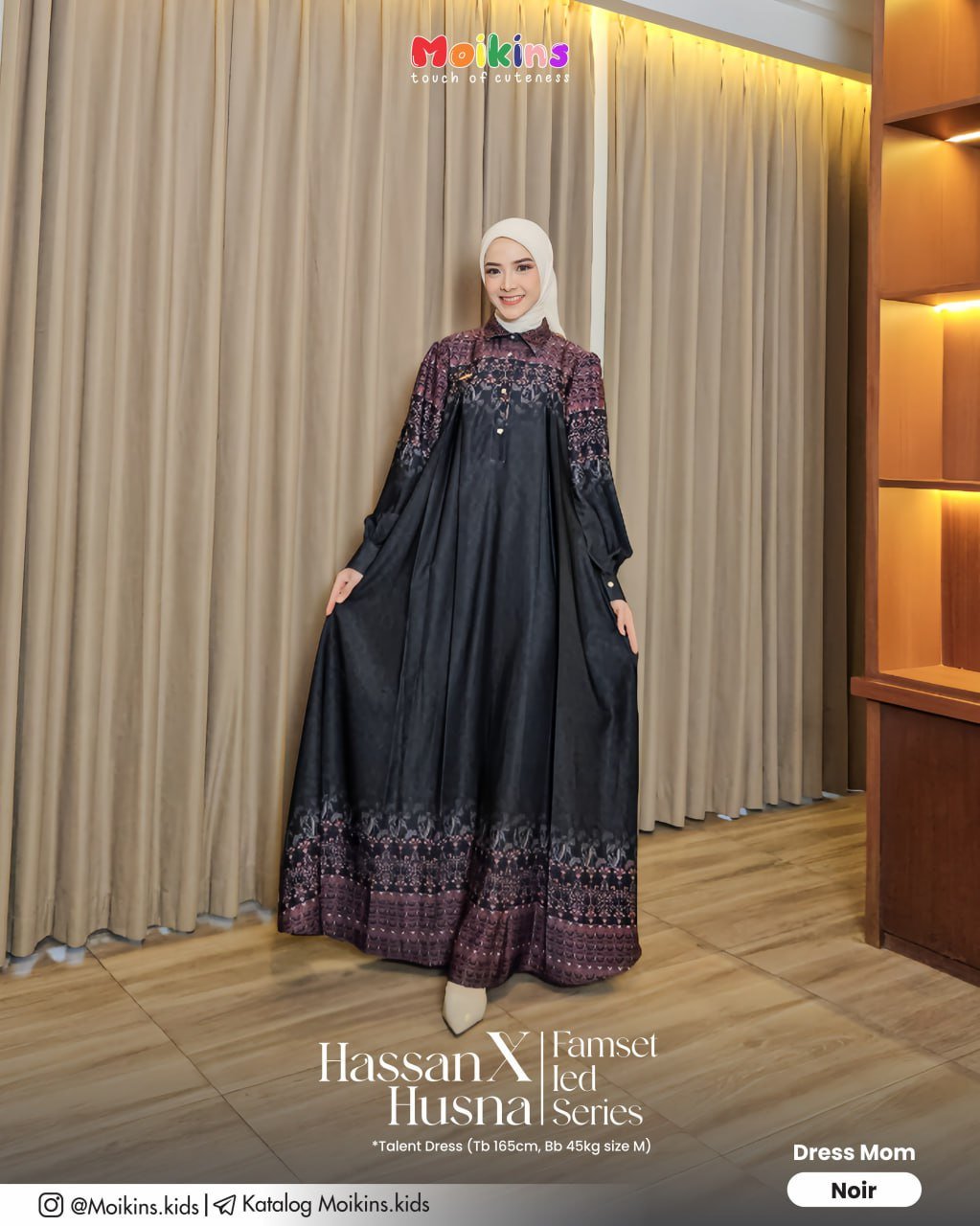 Tak ketinggalan, detail label metal gold Moikins di dada kanan jadi aksen elegan yang mempertegas kesan eksklusif pada Husna Dress ini.