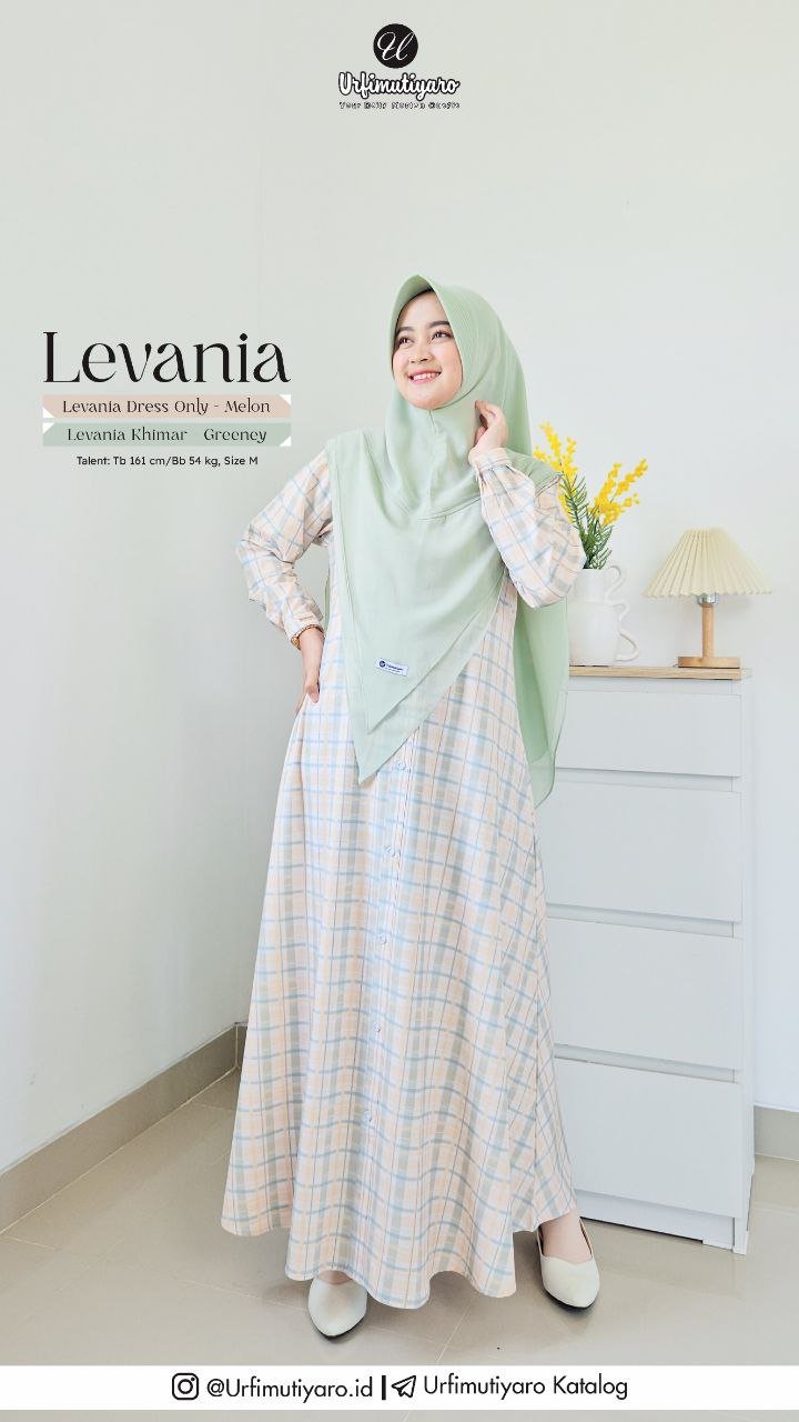 Levania dress menggunakan material Tory Strech, material spesial yang kami develop sendiri supaya bisa menghasilkan warna cantik dengan teknik digital printing. Material ini memiliki handfeel yang adem, jatuh, dan ironless. Permukaannya memiliki serat twill yang khas.