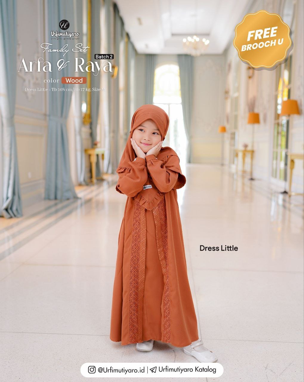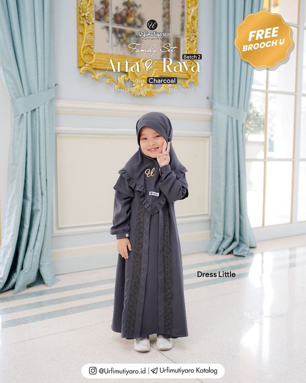 Little Raya dress didesain semi outer. Pada bagian depan terdapat kombinasi taffeta emboss dan renda yang mempunyai pattern square, yang senada dengan pattern emboss-nya. Bila diperhatikan ada lengan pendek dan panjang yang menempel sehingga sangat lucu dipakai anak-anak. Akses opening dress menggunakan sleting belakang.