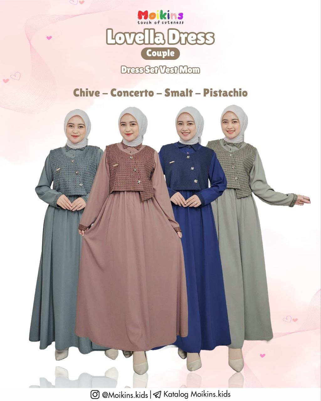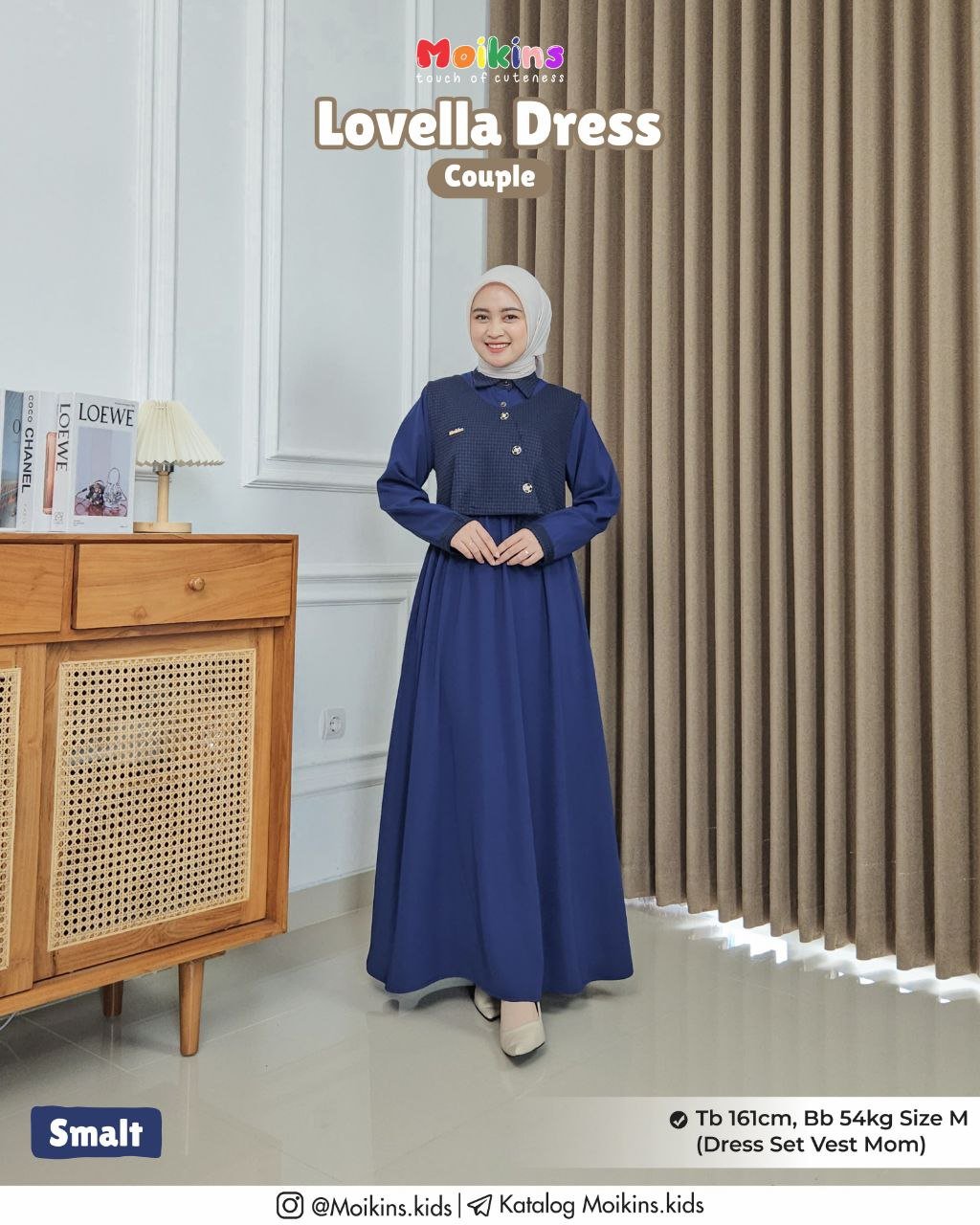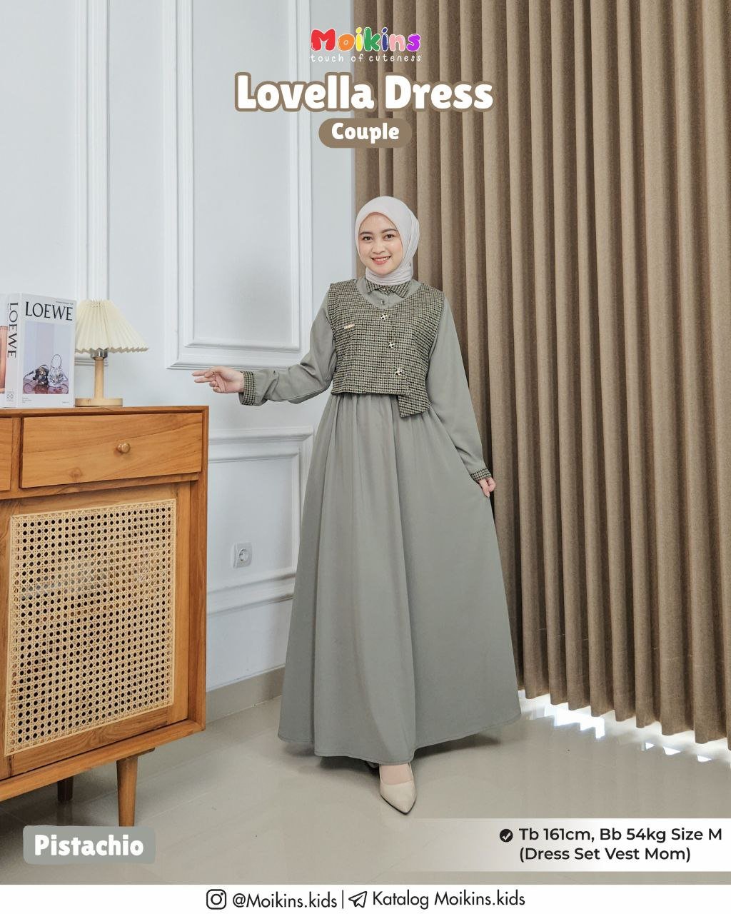 Lovella Dress dipairingkan dengan vest yang dapat dilepas pasang, jadi bisa Moms styling dengan outfit lain.