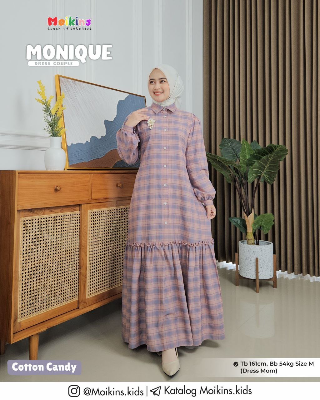 Monique Couple Dress menggunakan material cotton yang sifat materialnya adem dan sangat menyerap keringat, sehingga nyaman untuk dikenakan daily moms dan nakdis.
