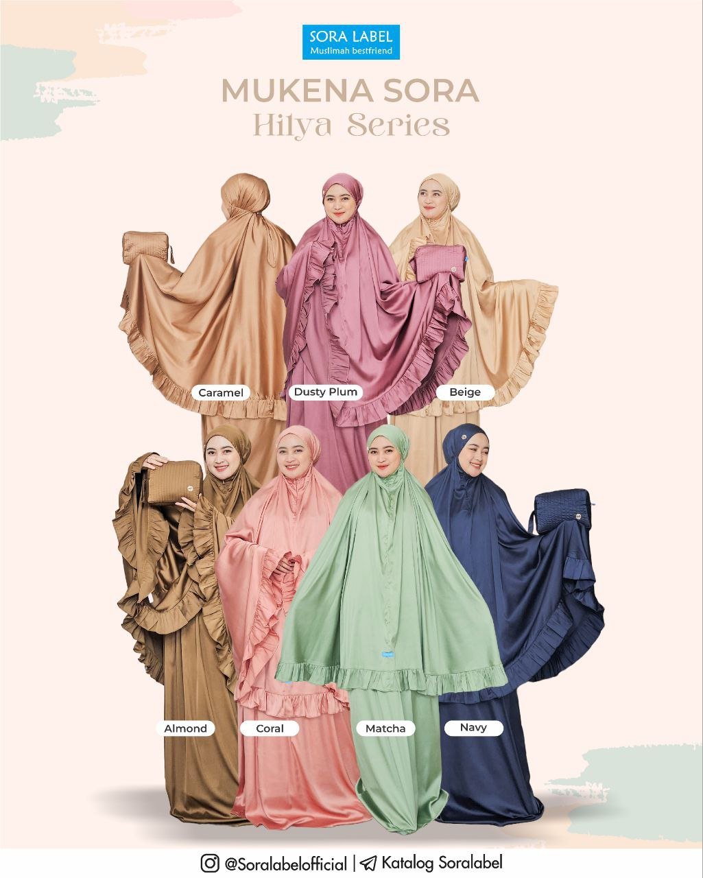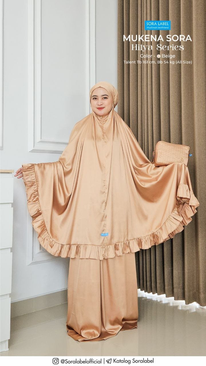 Terdapat rimpel pada bagian atasan mukena yang membuat mukena Hilya series semakin cantik dan dilengkapi dengan zipper untuk adjustable lingkar wajah. Dan dilengkapi dengam gold stoper untuk adjustable di bagian kepala sehingga lebih esklusif. Bagian karet pinggang dijahit tengah, sehingga karet aman tidak berputar di dalam jahitan. Mukena Hilya series ini terdiri dari: mukena atasan, bawahan yang dikemas dalam pouch yang simple namun tetap cantik dan dilengkapi label metal Soralabel. Untuk bawahan mukena Hilya Series menggunakan bahan yang sama polos jadi sangat matching dengan atasannya.