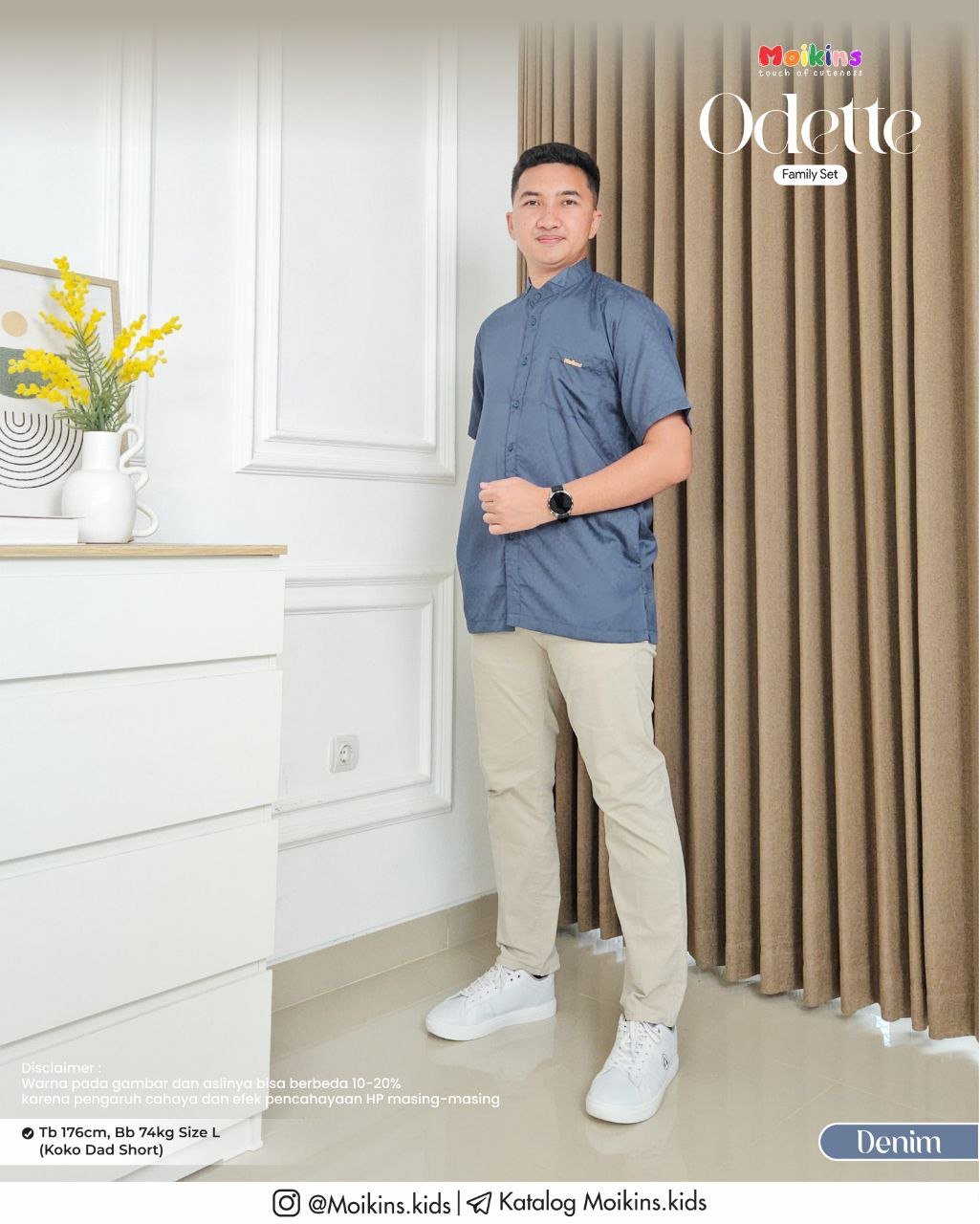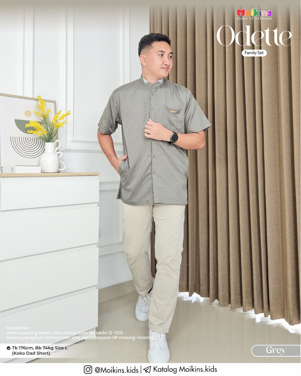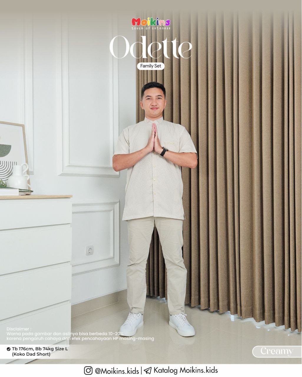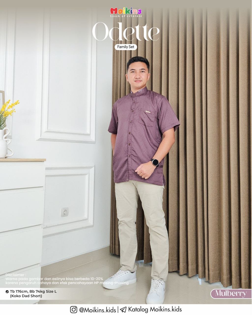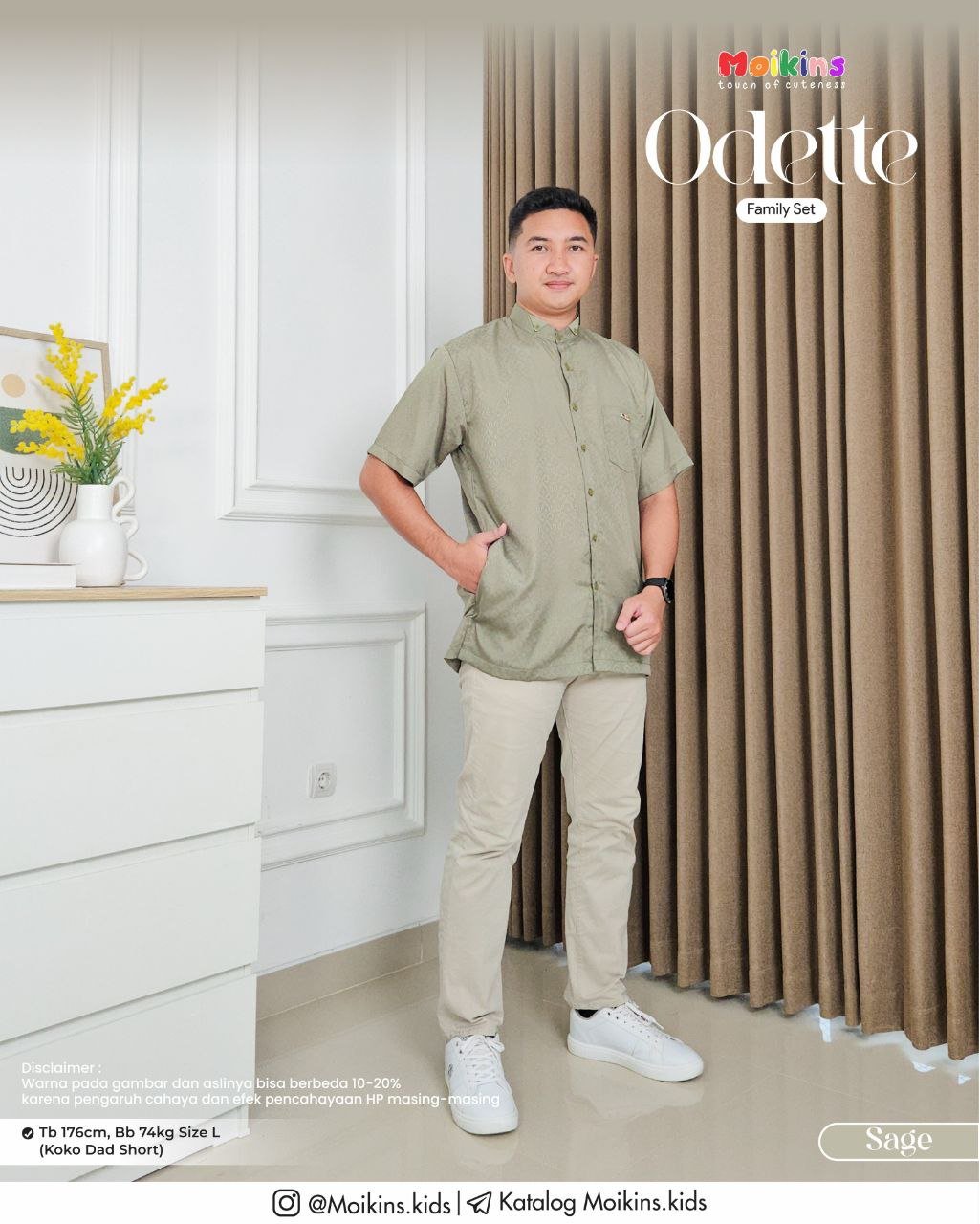 Berbeda dengan material dressnya, Koko Odette menggunakan material cotton dobby, dengan teknik digital coloring supaya warna yang dihasilkan lebih tajam. Bahan Cotton Dobby ini mempunyai gramasi sedang sehingga sangat cocok untuk cutting koko yang dicutting manly. Koko Odette terlihat gagah dan handsome, apalagi disupport dengan motif unik Dobby yang nampak bila terkena cahaya.