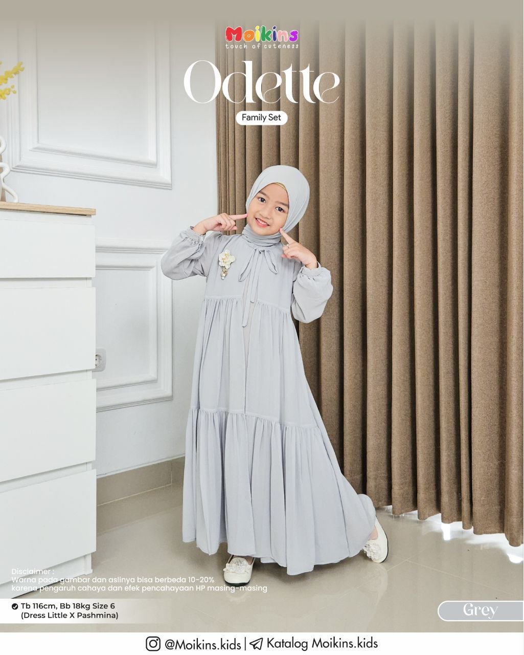 Odette Dress, Khimar dan Pashmina menggunakan material utama baby doll yang tidak mudah kusut dan ringan, sehingga memberikan efek flowy.