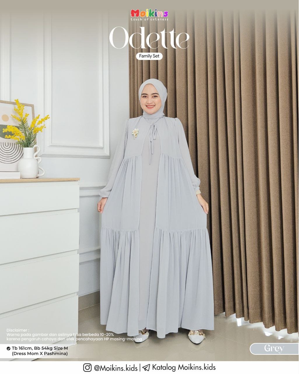 Odette Dress, Khimar dan Pashmina menggunakan material utama baby doll yang tidak mudah kusut dan ringan, sehingga memberikan efek flowy.