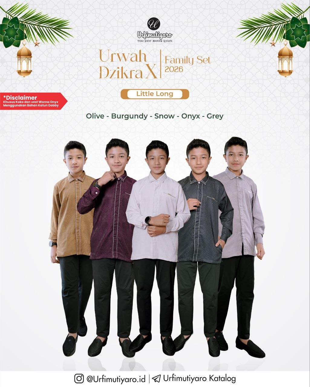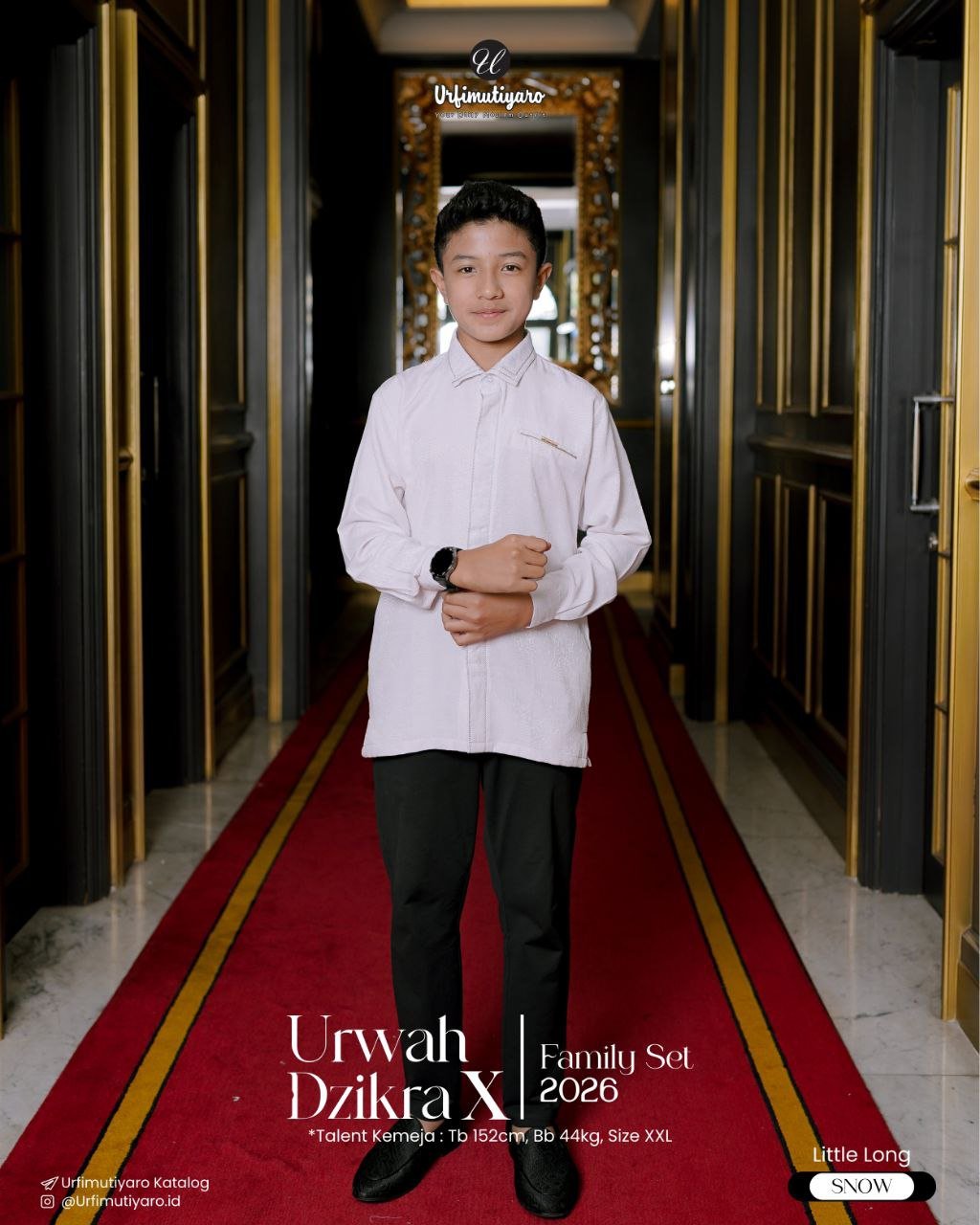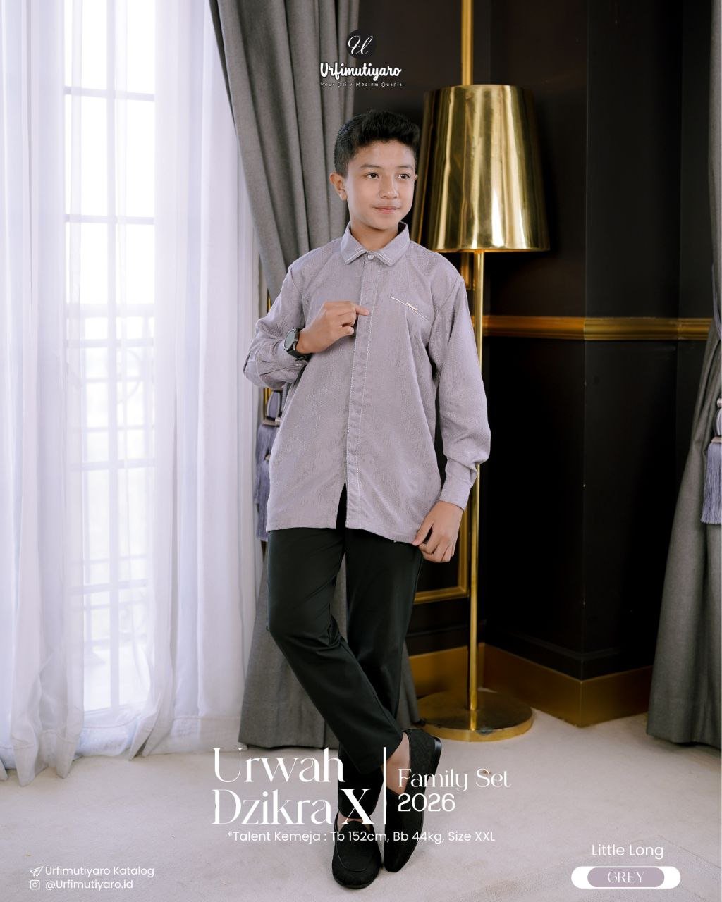Kemeja Urwah DAD dan LITTLE didesain reguler fit dengan cutting basic sehingga cocok dengan semua postur pria. Tahun ini URFI memilih kemeja (tentunya dengan kerah kemeja) supaya outfit Urwah bisa digunakan untuk ngantor setelah lebaran. Ada highlight bisban silver dan stitching benang smock di area kerah dan plaket depan untuk menyelaraskan tone warna DZIKRA dress. As usual, dan ini yang hanya ada di URFI, terdapat saku sembunyi di bagian kanan-kiri kemeja.